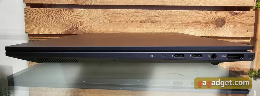 De aansluitingen zijn niet erg veel, maar ruim voldoende, zoals voor een compact ultradraagbaar model. Aan de rechterkant zitten twee Thunderbolt 4 connectoren met DisplayPort en Power Delivery ondersteuning, een 3,5mm audio combo jack en HDMI 2.0b. Net aan de linkerkant zijn twee LED-bedrijfsindicatoren.