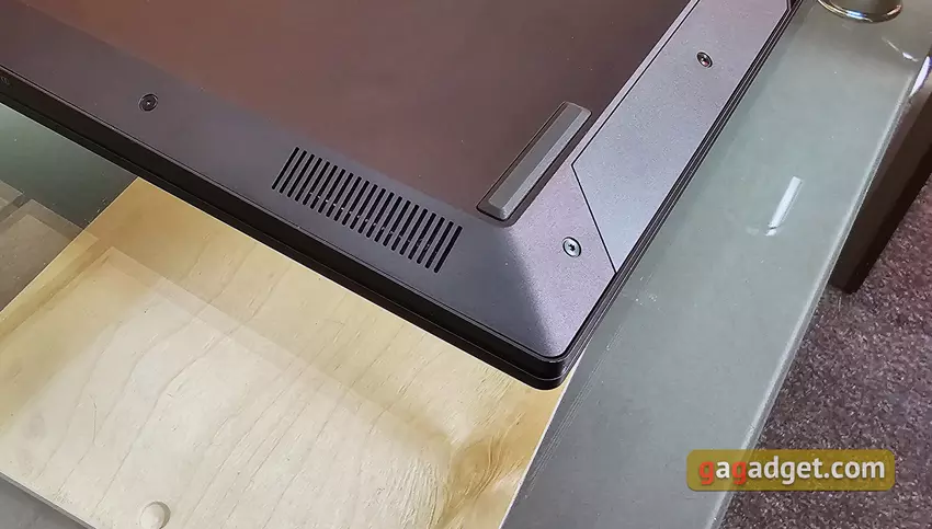 Aan de achterkant is er slechts een breed scharnier dat het grootste deel van de breedte van de laptop in beslag neemt. Aan de voorkant is de bekende uitsparing op het deksel. Geen andere functionele elementen.