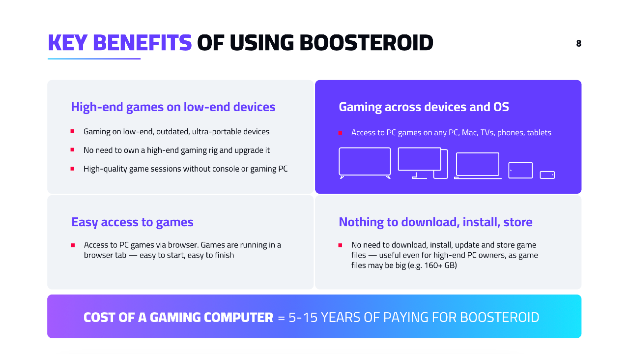 Slides uit Boosteroid presentatie: 1. schema van hoe de cloud gaming service werkt. 2. Voordelen van cloud gaming (bijv. de kosten van een spelcomputer komen overeen met 5 tot 15 jaar gebruik van Boosteroid). 3. Groei van het publiek van de dienst: nu heeft Boosteroid meer dan 4 miljoen gebruikers.