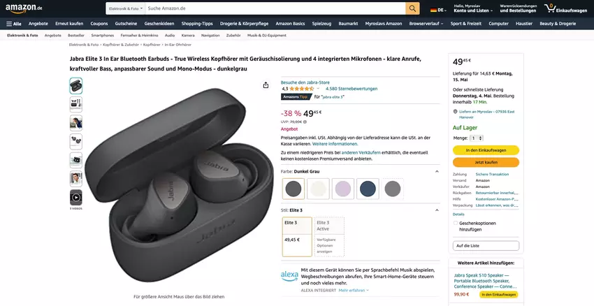 Jabra Elite 3 op Amazon: TWS-hoofdtelefoon met Bluetooth 5.2, IP55-bescherming en Google Fast Pair-ondersteuning voor €49 (38% korting)