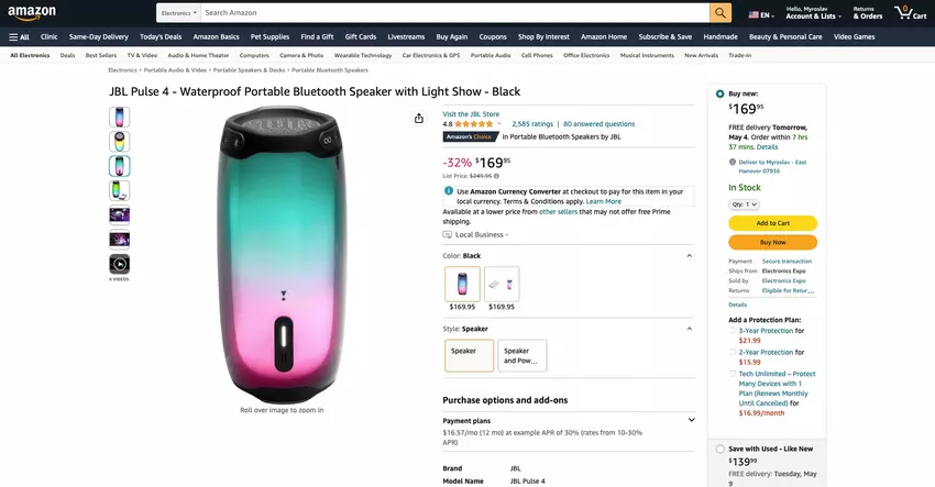 JBL Pulse 4 op Amazon: een draadloze luidspreker met IPX7-bescherming en achtergrondverlichting voor 80 dollar korting.
