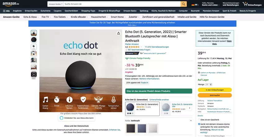 Amazon Echo Dot 5 Gen: slimme speaker met bewegingssensor, ingebouwde klok en Alexa voor 39 euro
