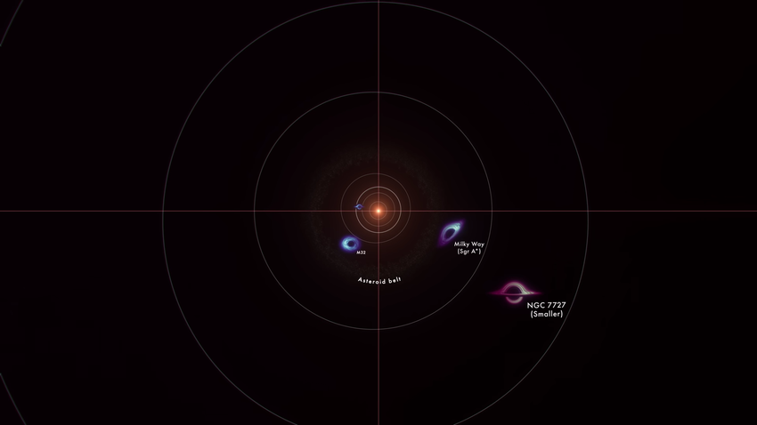 In de Melkweg bevindt zich natuurlijk een zwart gat. Het heet Sagittarius A*. Het is 4,3 miljoen keer massiever dan de zon. Dan toont de video de zwarte edelstenen van het sterrenstelsel NGC 7727. Ze hebben een massa van 6,3 miljoen en 154 miljoen zonsmassa's, en wanneer ze één object worden.