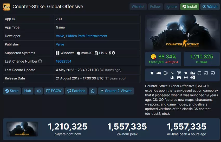 Volgens de statistieken van SteamDB heeft CS:GO een nieuw bezoekersrecord gevestigd: het maximale aantal spelers op de laatste dag was 1.557.335!
