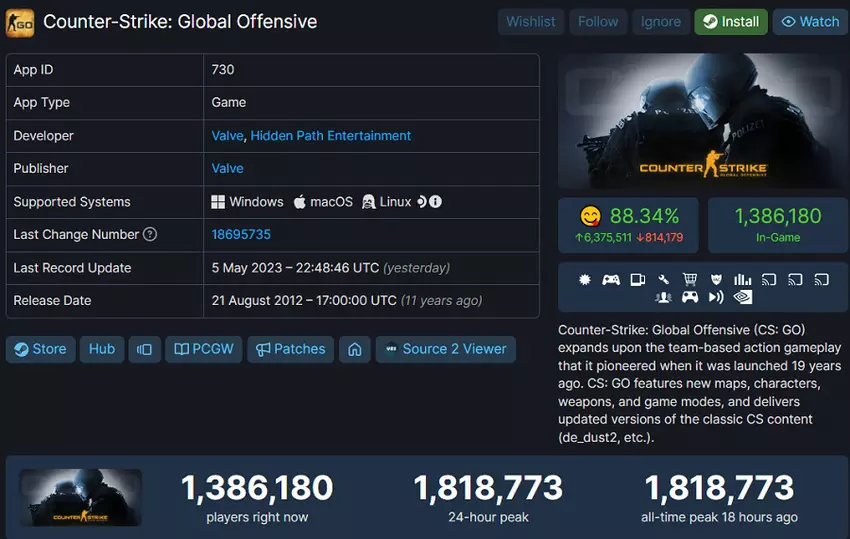 Volgens de statistieken van SteamDB heeft Counter-Strike: Global Offensive 1.818.773 gelijktijdige spelers, wat bijna 300 duizend meer is dan het vorige record.