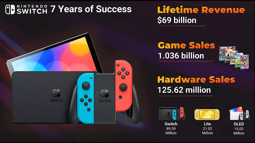 • In zeven jaar tijd zijn er 125 miljoen apparaten verkocht. Bijna 90 miljoen daarvan waren de standaardversie, 21,02 miljoen waren Nintendo Switch Lite-eenheden en van het model met OLED-scherm werden meer dan 15 miljoen exemplaren verkocht;