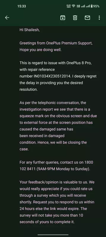 De eigenaar van de OnePlus 8 Pro nam contact op met het ondersteuningsteam van het bedrijf en kreeg te horen dat de oorzaak van de spontane verbranding "druk op het moederbord" was. Hij vindt deze bevindingen echter ongefundeerd en dringt aan op een grondiger onderzoek.