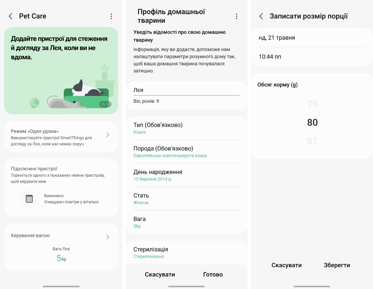 Veel mensen hebben huisdieren. Door het aantal katten in het algemeen staat Oekraïne in de top 10 van landen in de wereld. Het is dus niet verwonderlijk dat SmartThings aparte opties biedt voor de verzorging van uw harige huisdieren. U kunt hun gewicht en voedselinname monitoren en scenario's integreren met bijvoorbeeld luchtreinigers of automatische voederautomaten. Een kat of hond kan bijvoorbeeld in de gaten worden gehouden via de camera van een Samsung Jet Bot AI+ stofzuiger.