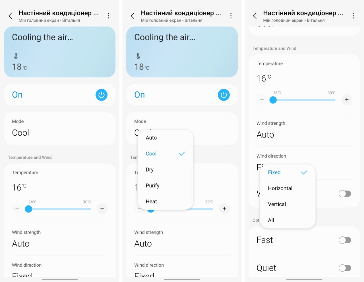 Een ander voorbeeld is de Samsung slimme airconditioner serie WindFree. In eerste instantie lijkt het erop dat de app alleen de mogelijkheden van de afstandsbediening dupliceert: hiermee kun je het apparaat in- en uitschakelen, de werkingsmodi aanpassen en de temperatuur in huis veranderen. Maar met de app kun je ook de werkingsmodi wijzigen volgens een weekschema, meldingen ontvangen en de airconditioner inschakelen als je het huis nadert (Welcome Cooling), en aanbevolen scenario's inschakelen om energie te besparen als er niemand thuis is. Op die manier kan een slimme balans worden bereikt waarbij geen elektriciteit wordt verspild en de airconditioner kan worden ingeschakeld voordat de gebruiker de kamer binnenkomt.