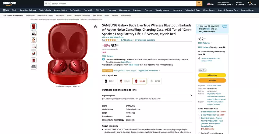 Samsung is begonnen met de verkoop van de TWS Galaxy Buds Live hoofdtelefoon met korting op Amazon.
