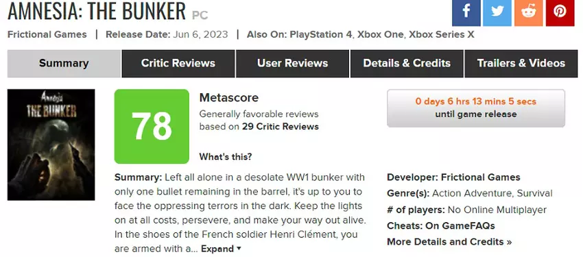 Amnesia: The Bunker heeft vrij hoge scores gekregen op aggregators: