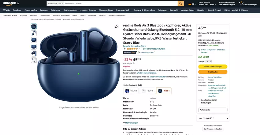 realme Buds Air 3 op Amazon: TWS-koptelefoon met ANC, IPX5-bescherming en tot 30 uur batterijduur voor €45,99 (korting €14)