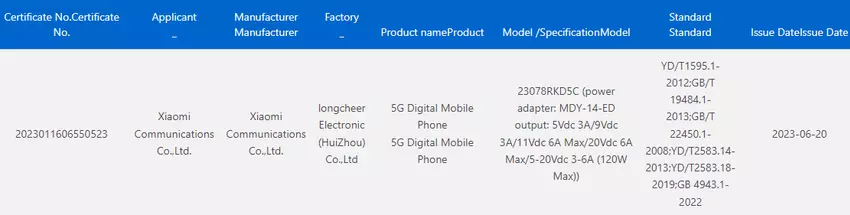 De gadget heeft modelnummer 23078RKD5C. Volgens de documenten ondersteunt de nieuweling snelladen met 120W vermogen via het Xiaomi MDY-14-ED power pack.