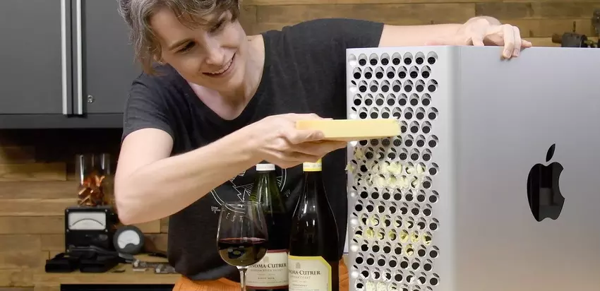 Over het algemeen is het ontwerp van de computer op geen enkele manier veranderd. De Mac Pro maakt nog steeds gebruik van een chassis met veel gaten, dat nog steeds wordt vergeleken met een rasp. Daarom liet een iFixit vertegenwoordiger de kans niet voorbijgaan om te proberen er kaas op te raspen. Dit werd een paar jaar geleden geprobeerd, toen Apple de Mac Pro opnieuw ontwierp. De tijd is verstreken, het model is geüpdatet en het resultaat is nog steeds hetzelfde: de pc is ongemakkelijk om kaas op te raspen. En de iFixit specialist koos verschillende soorten kaas, waaronder gouda, mozzarella en parmezaan. Parmezaanse kaas kan nog steeds geraspt worden op een PC van $7.000, maar niet zo goed met de andere kaassoorten.
