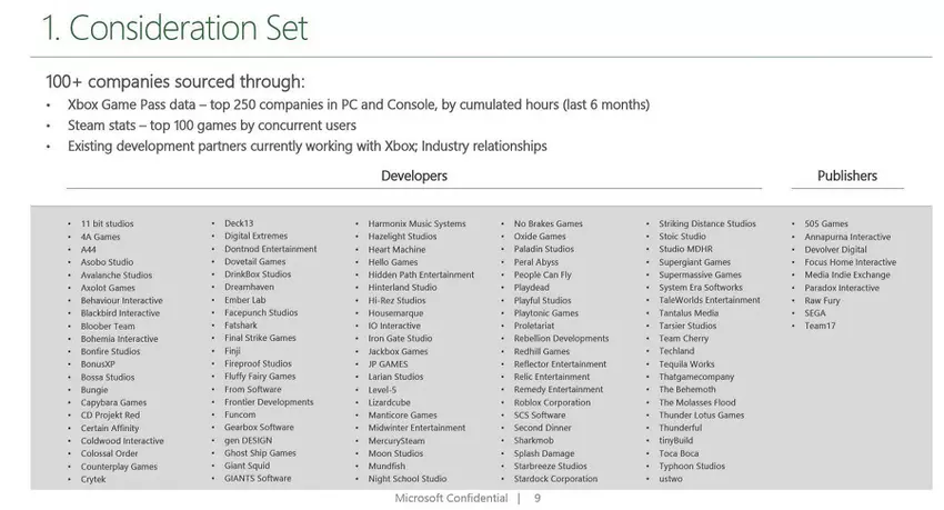 Een intern document met een lijst van meer dan honderd ontwikkelaars, dat in de rechtszaal verschijnt, werd opgesteld in 2020. Tot nu toe wordt gemeld dat de honger van Microsoft is verminderd en dat er slechts 17 bedrijven op de huidige lijst staan, waaronder zeker Remedy Entertainment, Crytek, IO Interactive en People Can Fly.