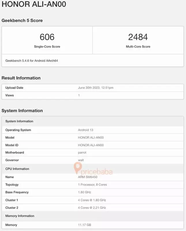 De Honor X50 wordt aangedreven door de Snapdragon 6 Gen 1 processor. De chip heeft acht kernen tot 2,2 GHz en Adreno 710 graphics. De prestatietest is geslaagd voor de versie met 12GB RAM. De Geekbench database geeft ook aan dat de smartphone op Android 13 zal draaien.