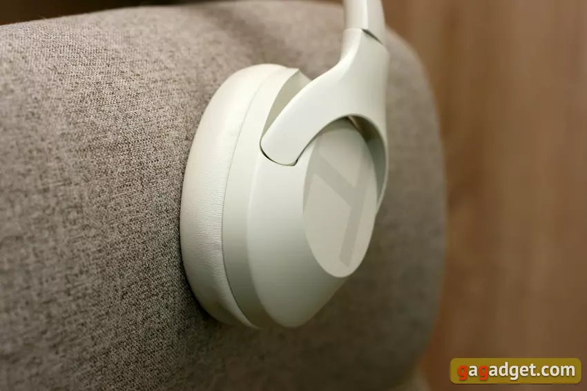 Alle oppervlakken van het product zijn bekleed met geborsteld plastic of zacht lederachtig materiaal. Het ziet er netjes en schoon uit en de pasvorm is goed. Aan de buitenkant van de oorkussens zie je de letter "H" ter ere van de fabrikant en decoratieve glanzend gepolijste metalen inzetstukken. Alle technische inscripties zijn op een subtiel vlak bij het scharnier geplaatst, een goede oplossing.