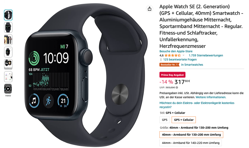 Apple Watch SE 2 met eSIM kan worden gekocht op Amazon Prime Day 2023 uitverkoop met een korting van 51,7 euro