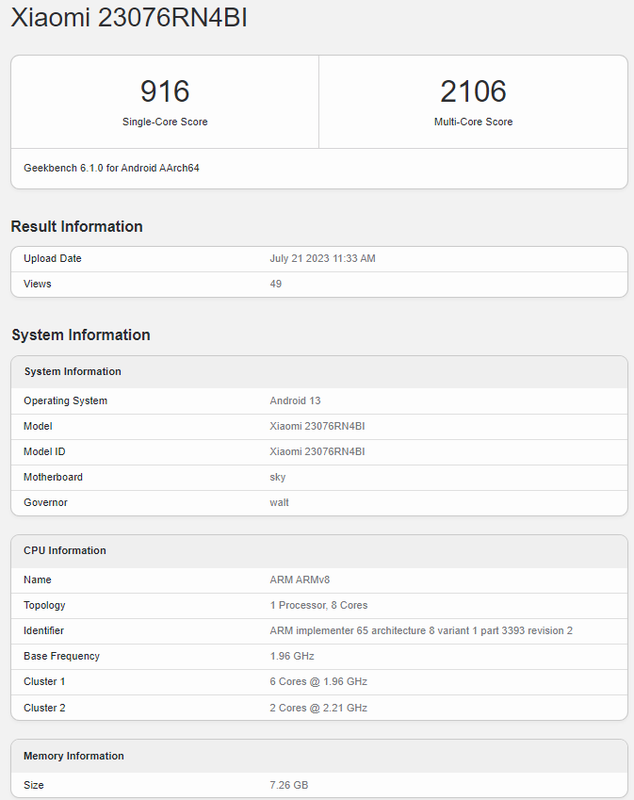 De Redmi 12 5G heeft als modelnummer 2307RN4BI. De laatste letter geeft aan dat de versie voor de Indiase markt Geekbench heeft gehaald. De smartphone wordt naar verwachting op 1 augustus onthuld in India.
