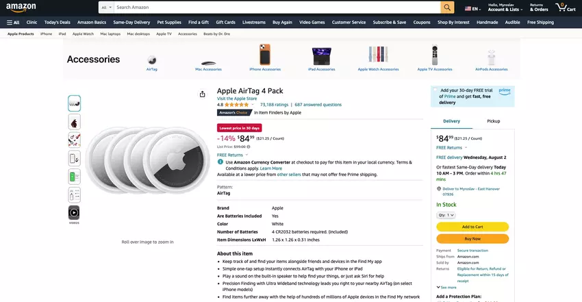 De set van 4 tags is te koop bij Amazon voor een actieprijs van $92.18 $99.00, -7%. Ter vergelijking: alleen een AirTag kost $24.00 $29.00, -17%