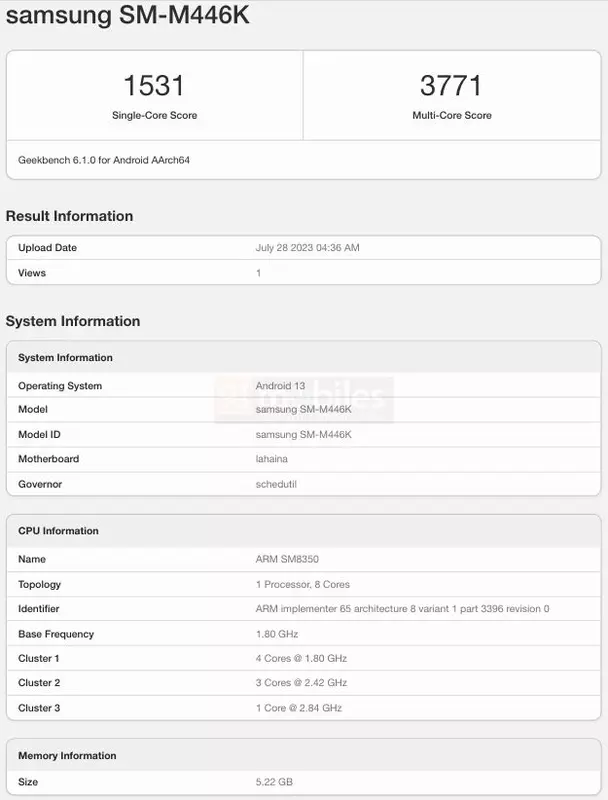 De gadget gaat Galaxy M44 5G heten. Onze collega's van 91mobiles hebben de nieuwigheid gespot in de database van de Geekbench-prestatietest. De smartphone komt voorbij met het modelnummer SM-M446K.