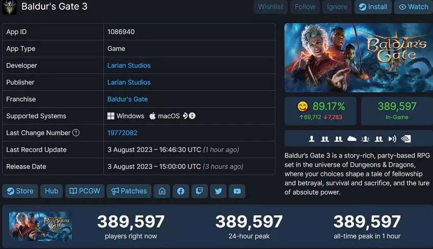 Uren na de release nadert de online piek van Baldur's Gate III de 400.000 mensen en blijft snel groeien