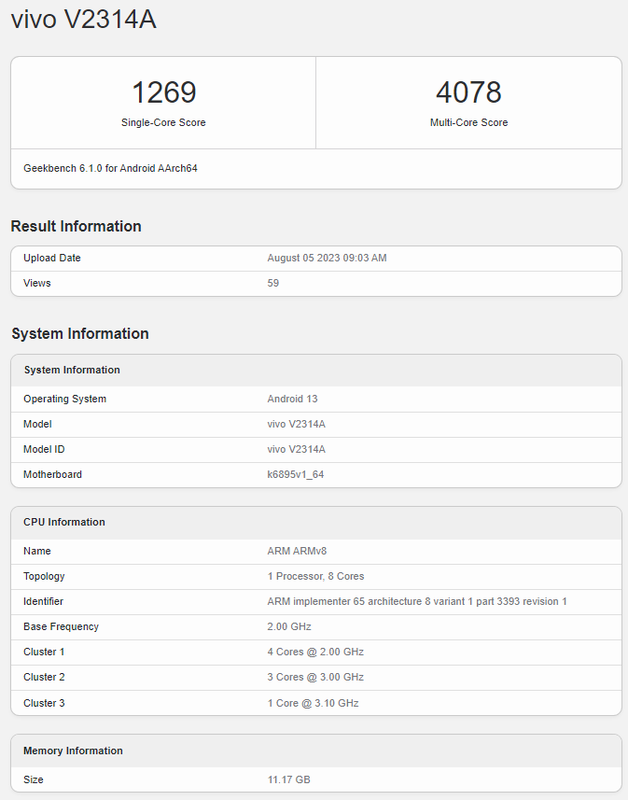 De iQOO Z8 met Dimensity 8200 scoorde respectievelijk 1269 en 4078 in Single-Core en Multi-Core modi. De aankondigingsdatum van de smartphone is nog niet bekend.