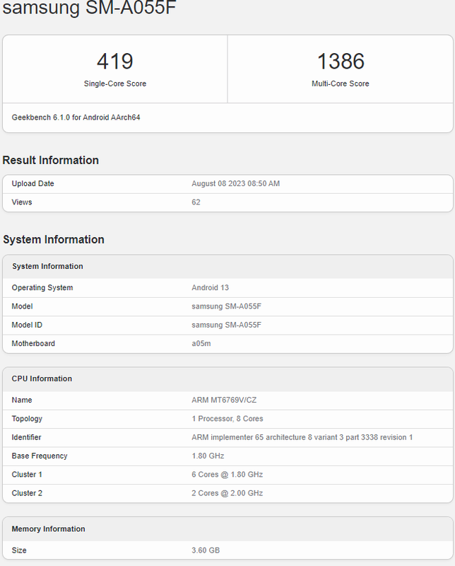 Samsung Galaxy A05 met Helio G85-processor en Android 13 heeft de prestatietest in Geekbench 6 doorstaan