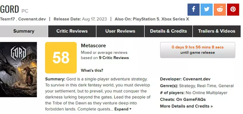Zo krijgt de versie van Gord voor pc op Metacritic slechts 58 punten, terwijl de versie voor PlayStation 5 75 punten krijgt. Waarschijnlijk is zo'n groot verschil in scores te wijten aan technische problemen van het spel op pc's.