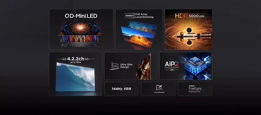 De nieuwe producten hebben een diagonaal van 85" en 95". In beide gevallen worden QD-Mini LED-panelen van 4K ULTRA HD-formaat met een resolutie van 3840 x 2160 pixels gebruikt. De vernieuwingsfrequentie van het beeld is 144 Hz. AMD FreeSync Premium Pro ondersteuning moet ook worden vermeld.