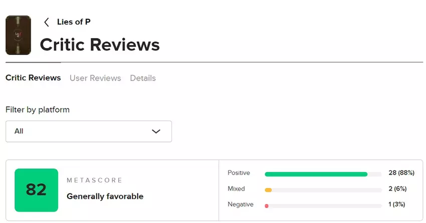 Vandaag was er op Metacritic een grote update van de interface en nu is daar een algemene score beschikbaar die rekening houdt met de versies voor alle platforms, en de algemene score van Lies of P is 82.