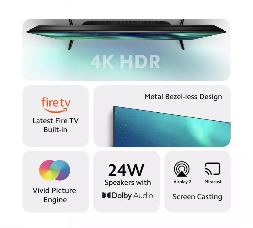 We hebben het over de 43-inch versie van Smart Fire TV 4K. De nieuwigheid kreeg Vivid Picture Engine-technologie, evenals 24-watt luidsprekers met ondersteuning voor Dolby Audio, DTS-HD en DTS: Virtual X. De tv draait op het Fire TV OS 7-besturingssysteem. De nieuwigheid heeft Wi-Fi 802.11 ac (2,4/5 GHz), AirPlay 2, Miracast, Bluetooth 5.0, evenals HDMI, USB 2.0 en 3,5mm poorten. Het apparaat is voorgeladen met de apps Prime Video, Netflix, Disney+ en YouTube.