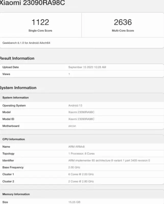 De Chinese versie van de smartphone heeft het nummer 23090RA98C. De modificatie die is uitgerust met 16 GB RAM scoorde respectievelijk 1122 en 2636 punten in Single-Core en Multi-Core modi. Het model draait op besturingssysteem Android 13.