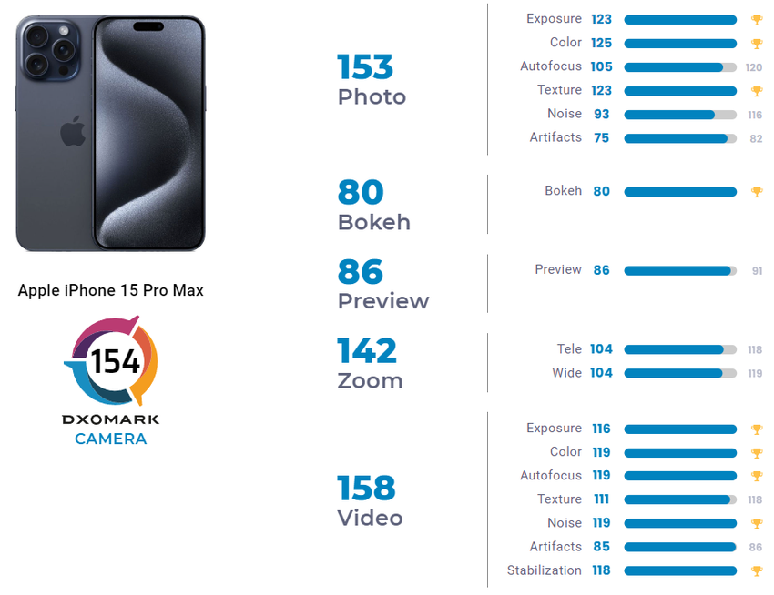 De smartphone kreeg 153 punten voor foto's en 158 punten voor video. In een aantal categorieën werd de iPhone 15 Pro Max de leider, maar het was niet genoeg om de top te halen. Met een score van 154 punten nam de nieuwigheid van Apple de tweede plaats in, achter de Huawei P60 Pro.