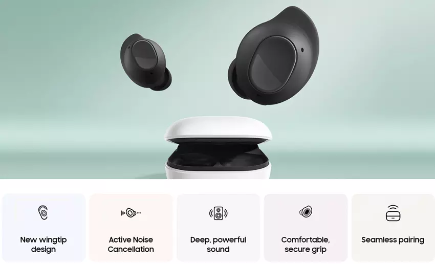 De nieuwigheid heeft de naam Galaxy Buds FE gekregen. De hoofdtelefoon lijkt uiterlijk op de Galaxy Buds 2 en Galaxy Buds 2 Pro. Het model heeft een vacuümontwerp en beschikt over een geluidssysteem met actieve ruisonderdrukking (ANC). Samsung heeft de hoofdtelefoon uitgerust met Bluetooth v5.2 met AAC-, SBC- en SSC-codecs, een drievoudig microfoonsysteem en touchpads voor de bediening. Het nieuwe product beschikt over een Ambient Sound-modus en IPX2-bescherming.