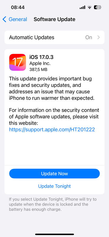 De firmware heet iOS 17.0.3 en het buildnummer is 21A360. Het systeem weegt ongeveer 400 MB en wordt nu al in golven uitgerold naar alle ondersteunde iPhone-modellen over de hele wereld.