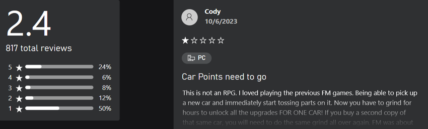 De situatie in de Xbox Store is ook niet best. Daar kreeg Forza Motorsport 2,4 uit 5. Spelers uiten dezelfde kritiek als op Steam.