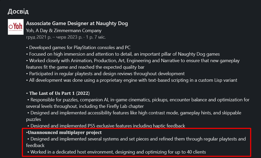 Het LinkedIn-profiel van Ian Blake, die tot juni 2023 gamedesigner was bij Naughty Dog, onthulde dat hij in de studio werkte aan een onaangekondigd online project, waarschijnlijk het multiplayerspel The Last of Us. Hij gaf aan dat hij bezig was met het maken van een lobby die tot 40 spelers ondersteunt en met het maken van andere systemen. Dat wil zeggen dat we een grootschalige 20v20-modus konden verwachten, maar of we die ooit zullen zien is een groot mysterie.