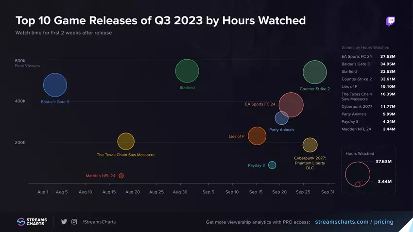 Het analyseportaal Streams Charts heeft een ranglijst gepubliceerd van de populairste games op Twitch die in het derde kwartaal van 2023 zijn uitgebracht. Het portaal houdt echter alleen rekening met de eerste twee weken na de release, omdat sommige games meer dan een maand geleden zijn uitgebracht, terwijl andere recentelijk zijn verschenen.