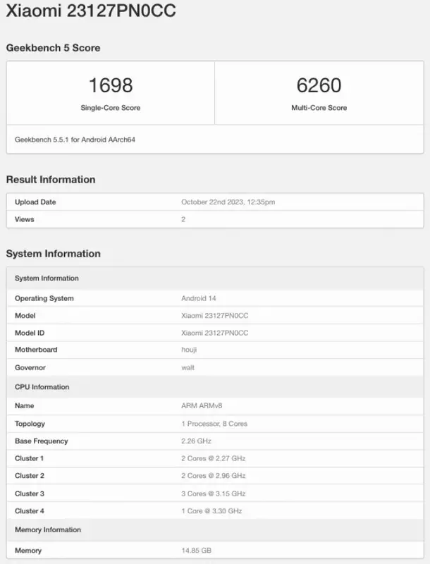 In de database van de populaire benchmark verscheen een modificatie met 16 GB RAM. Naar verwachting zal de Xiaomi 14 ook beschikbaar zijn met 12 GB en mogelijk met 8 GB RAM.
