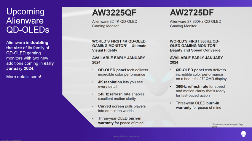Alienware toonde gaming monitoren AW3225QF en AW2725DF. Beide zijn gebaseerd op QD-OLED panelen. Volgens de fabrikant is de AW3225QF 's werelds eerste monitor met een 4K ULTRA HD QD-OLED beeldscherm. Het heeft een verversingssnelheid van 240 Hz, een gebogen scherm en ondersteuning voor AMD Freesync Premium technologie.