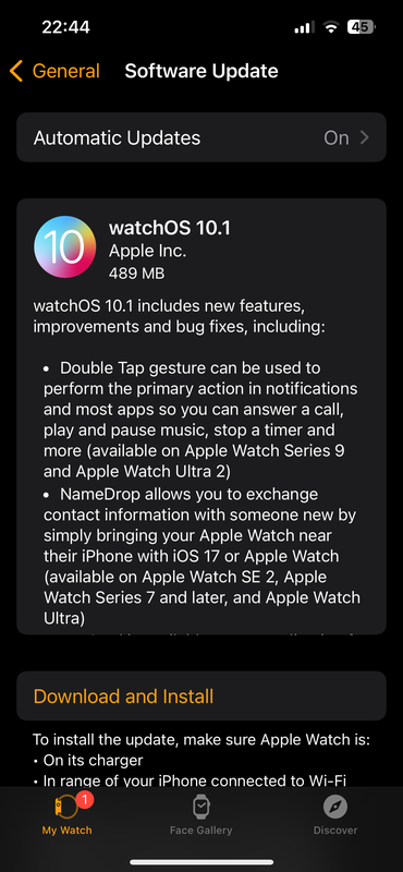 De firmware is uitgebracht onder de naam watchOS 10.1 en weegt meer dan 400 MB. De update bevat een aantal bugfixes, verbeterde beveiliging en een paar nieuwe functies: NameDrop en Double Tap. Met de eerste kunnen gebruikers snel contacten uitwisselen tussen het slimme horloge en de iPhone. Hiervoor moet je de gadgets naar elkaar toe brengen.