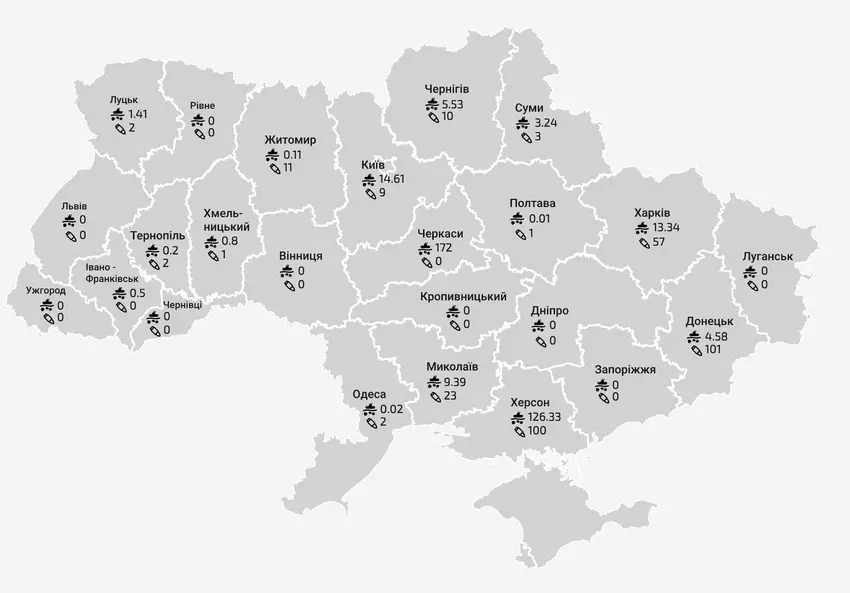 Volgens de Staatsnooddienst van Oekraïne (SESU) hebben haar medewerkers al 447.841 explosieven onschadelijk gemaakt en meer dan 100.000 hectare in Oekraïne in kaart gebracht. Gemiddeld ruimt de SESU 350 hectare mijnen en maakt ze 320 explosieven onschadelijk per dag, waarbij 140 bezoeken worden afgelegd. Het grootste aantal ERW's werd onschadelijk gemaakt in de regio's Kharkiv (81.490), Kyiv (80.045), Chernihiv (52.289) en Donetsk (47.225). Volgens het VN-Bureau voor de Coördinatie van Humanitaire Aangelegenheden(OCHA) is Oekraïne een van de landen met de meeste mijnen ter wereld.