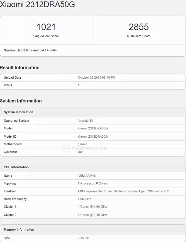 De smartphone heeft modelnummer 2312DRA50G. Het laatste symbool betekent dat hij draait op de wereldwijde MIUI 14-firmware. Het resultaat in de prestatietest was 1021 en 2855 punten in respectievelijk Single-Core en Multi-Core modi.