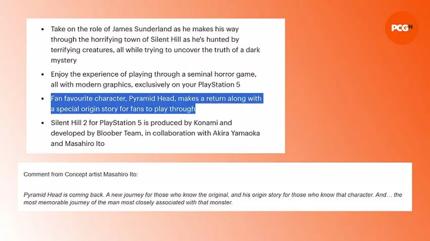 Na de aankondiging van de game in oktober 2022 zei de Japanner dat "Pyramid Head na 20 jaar terugkomt" en het was deze zin die op de een of andere manier in de geest van een Best Buy-medewerker veranderde in een feit: het monster zal meer aandacht krijgen in de game.