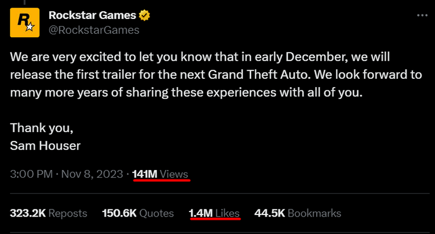 Op 8 november kondigde Rockstar Games aan dat het begin december de eerste trailer van Grand Theft Auto 6 zou laten zien. Dit veroorzaakte zoveel ophef dat de aankondiging de populairste gametweet op Twitter werd.