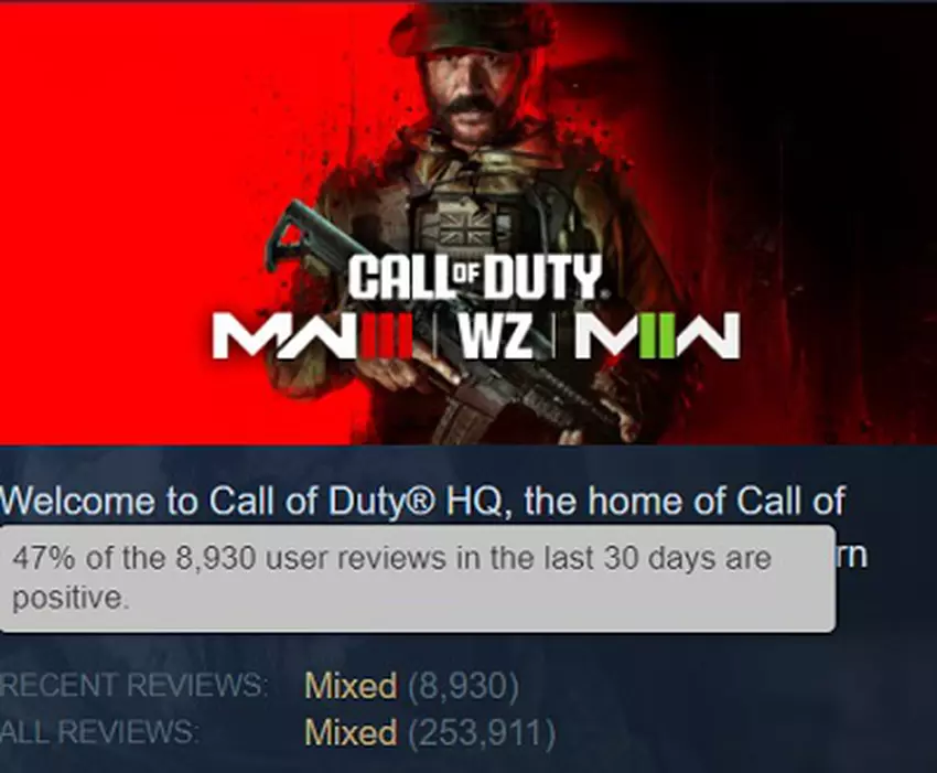 Op het moment van schrijven heeft Call of Duty: Modern Warfare III (2023) slechts 47% positieve beoordelingen. En dan hebben we het nog niet eens over twee games uit de serie, want die zijn gecombineerd op Steam.