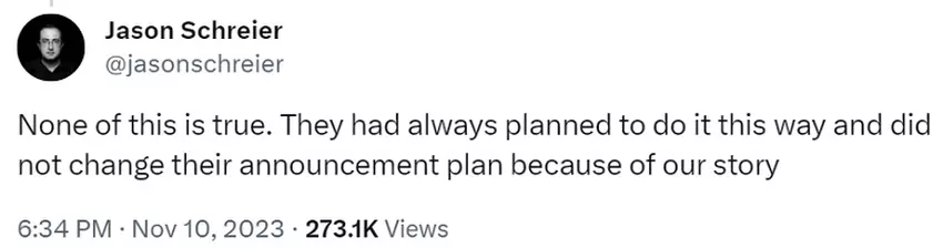 Helaas voor de ontwikkelaars was er geen verrassing, want een paar uur eerder had de gezaghebbende insider en Bloomberg-journalist Jason Schreier het publiek geïnformeerd over de aanstaande aankondiging.
