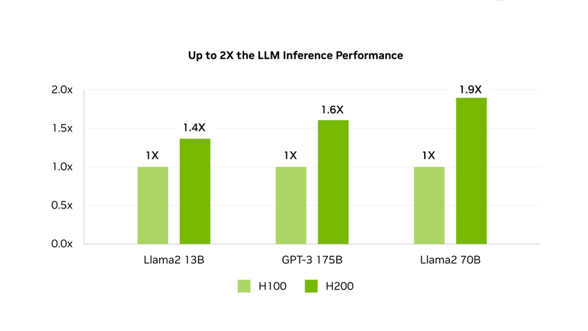 NVIDIA claimt dat de nieuwe chip bijna twee keer betere prestaties levert bij generatieve AI-taken dan de H100. De evaluatie is gebaseerd op het testen van GPT-3 en Llama 2-taalmodellen.