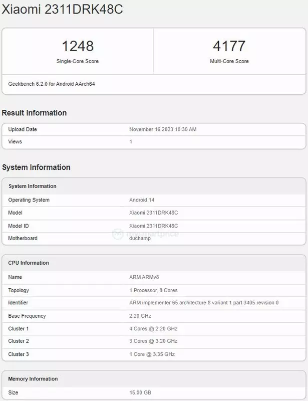 De nieuwigheid in het rapport komt voorbij met het modelnummer 2311DRK48C. Het lek bevestigt dat de gadget zal worden aangedreven door een nieuwe MediaTek Dimensity 8300-processor. De SoC wordt volgende week uitgebracht. De smartphone wordt ook geleverd met 16GB RAM en het Android 14 besturingssysteem.